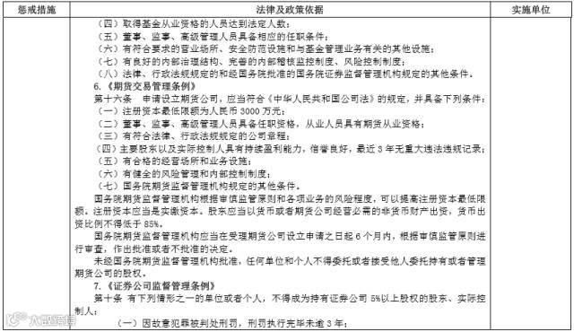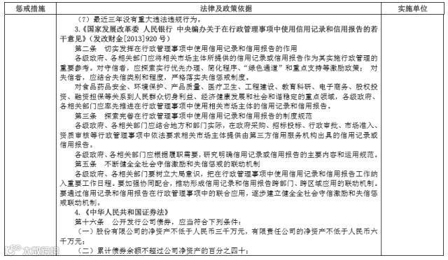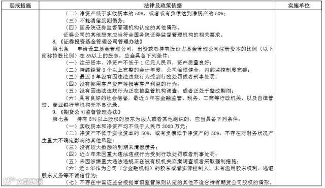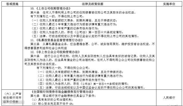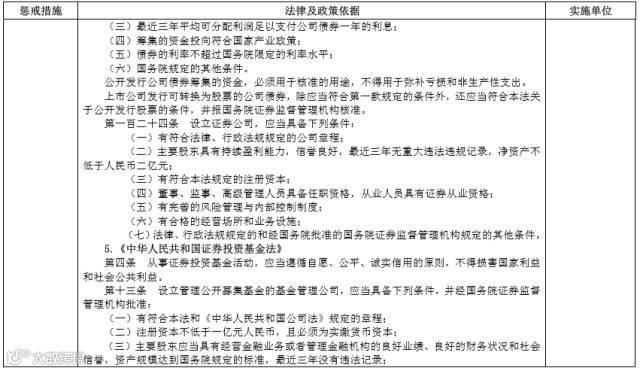 将失信责任主体相关信息作为证券公司、基金管理公司、期 货公司设立及变更持有 5%以上股权的股东、实际控制人审批,私募投资基金管理人登记的依据或参考;从严审核失信责任主体发行企业债券及公司债券;对失信情形严重的失信责任主体,在上市公司或者非上市公众公司收购的事中事后监管中,对有严重 失信行为的生产经营单位予以重点关注。