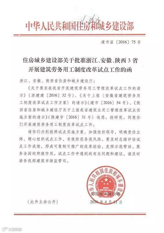 2.《住房城乡建设部关于批准浙江安徽陕西3省开展建筑劳务用工制度改革试点工作的函》