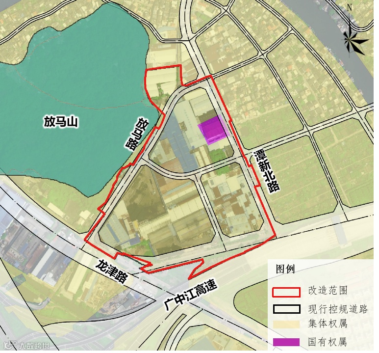 项目改造范围12.31公顷(约185亩),东临潭新北路,南接广中江高速,西靠放马山。涉及4宗集体用地(占总改造范围97.5%)和1宗国有划拨用地(占总改造范围2.5%),改造需重点解决土地权属整合、控规道路调整及耕地“占补平衡”落实等关键问题。
