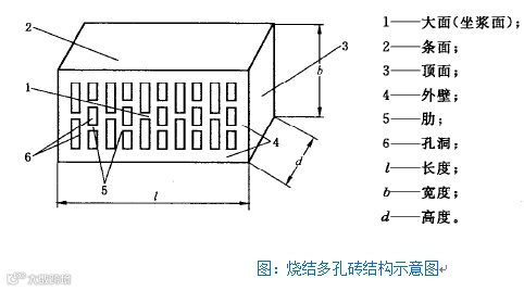 外形结构,烧结多孔砖由两两相对的顶面、大面、条面组成直角六面体,中部开设有至少两个均匀排列的条孔,条孔与大面和条面平行,成为外壁。烧结多孔砖在与砂浆的结合面上应设有增加结合力的粉刷槽和砌筑砂浆槽,当两个条面或顶面部都有砌筑砂浆槽时,砌筑砂浆槽深度应在大于15mm小于 25mm之间,一个条面或顶面有砌筑砂浆槽时,砌筑砂浆槽深应在大于30mm小于40mm之间,过砂浆槽宽度是所在砌块面宽度的50%。