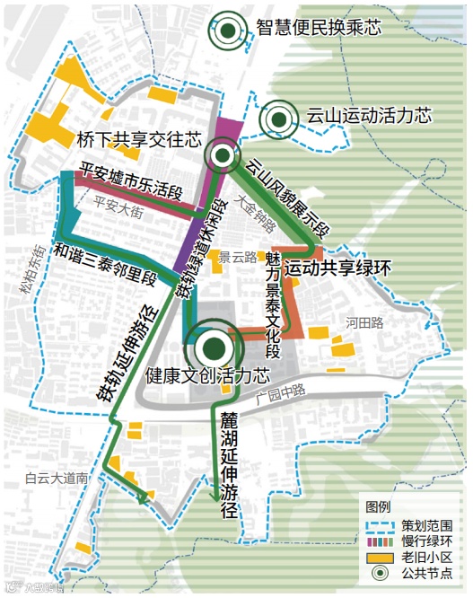规划制定成片连片策划方案,对原本被高/快速路分割成碎片化用地的20个老旧小区进行连片整合,形成片区空间规划布局(图2),并从3个方面强化实施连片更新:①慢行网络织补。通过打造片区慢行绿环,串联各个老旧小区,弱化城市干道对片区的分割影响。同时,为片区中青年人群增加公共活动及运动空间,挖掘并营造历史文化场景,结合在地文化组织开展活动,以增强老旧小区居民的凝聚力和归属感。②共享空间盘活。规划对高架桥下低效空间及政府储备用地进行激活改造,遵循“全龄友好、时空共享、代际互助”的原则,为片区补充停车、运动、休闲等功能,并强化交通引导。③设施分时利用。结合片区80%的中青年人口结构特征,规划在设施利用方面充分考虑老人、儿童及中青年人口的生活作息规律,引导服务设施的分时合理利用。