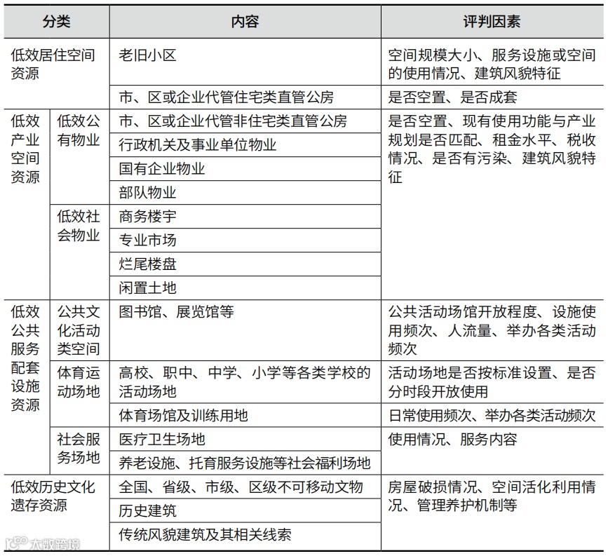潜力资源指的是当前使用效率较低,但通过更新改造能够提升使用效率,从而成为片区内具有可利用价值的资源,具体涵盖低效居住空间资源、低效产业空间资源、低效公共服务配套设施资源、低效历史文化遗存资源4类。低效居住空间资源主要包括老旧小区和住宅类直管公房;低效产业空间资源包括低效公有物业(如非住宅类直管公房、行政机关及事业单位物业、国有企业物业、部队物业等)、低效社会物业(如商业楼宇、专业市场、烂尾楼盘和闲置用地等);低效公共服务配套设施资源涵盖公共文化活动类空间(如图书馆、展览馆等)、体育运动场地(如各类学校的活动场地、体育场馆及训练用地等)以及其他社会服务场地(如医疗卫生场地、社会福利场地等);低效历史文化遗存资源包括不可移动文物、历史建筑、传统风貌建筑及其相关线索等。通过现状评估,可以形成老旧小区成片连片改造的潜力资源库,具体评判因素详见表1。结合产权状况,属于政府公有的低效资源可优先考虑作为后续可利用资源;属于非公有的低效资源,则可通过片区策划方案的编制,为权属主体与运营主体提供合作机会。
