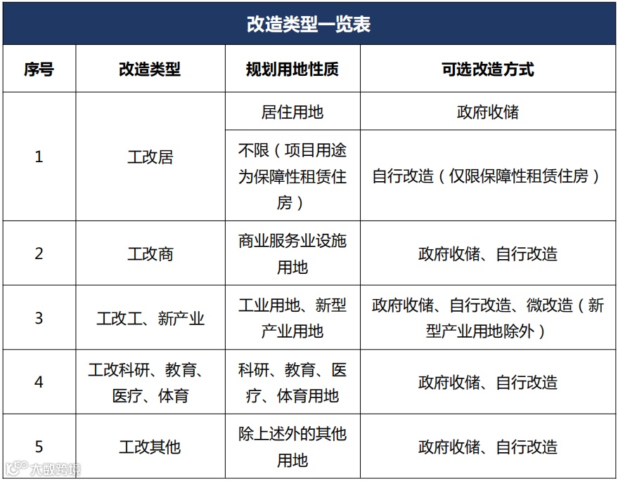 (1)改造类型。根据项目实际情况,项目范围内可能会涉及多种规划用地性质,会形成复合改造类型,如“工改居+工改商”,此类项目需结合项目实际情况,在方案中分别划定对应区域,“工改居”、“工改商”的部分各自按照相应规定执行。