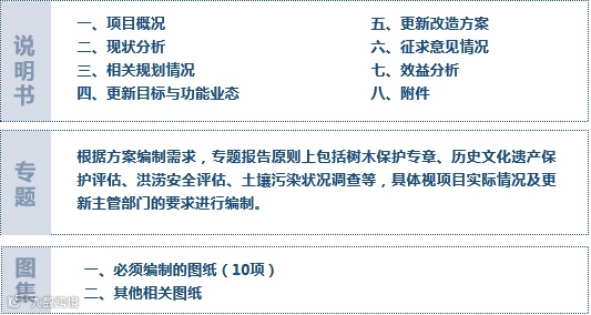方案编制通常由专业的规划设计单位完成,分为说明书、专题报告、图集三个部分。说明书主要针对项目的现状情况、规划情况、改造方案情况展开介绍,专题报告主要针对树木保护、洪涝安全、土壤污染展开评估,保障项目的可行性,图集主要用于展示及归档。