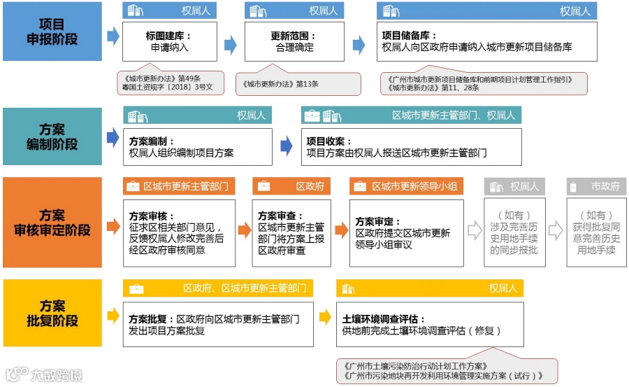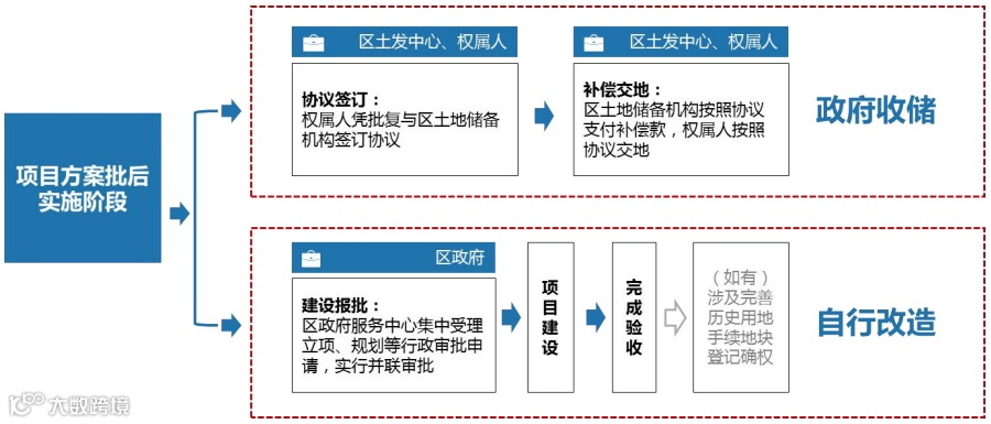 前四个阶段为通用流程,与选择的改造方式无关。最后的方案批后实施阶段将根据选择的改造方式(政府收储或自行改造)略有不同,选择政府收储的需要与区土地储备机构签订收储协议后,按协议要求交地;选择自行改造的需要自行开展建设报批、建设、验收工作。