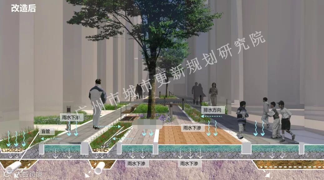 目前,我院已将海绵城市概念应用于越秀区等众多老旧小区微改造工程中。我院设计师结合社区的实际情况,在小区公共区域,通过重新规划排水管道排布、管道更换、立管雨污分流、改造社区绿地及人行道等,达到海绵城市的技术要求和效果。