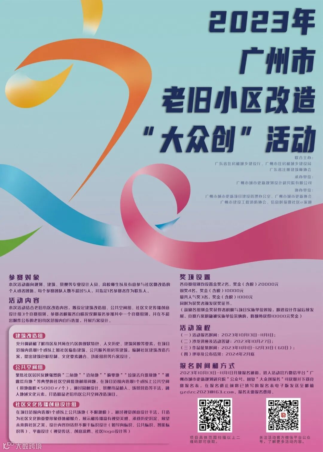 2023年10月13日-11月1日开放报名通道,进入活动官方微信平台“广州市城市更新规划研究院”公众号,回复“大众创报名”可获取并下载竞赛报名表(点击下载附件:2023年度广州市老旧小区改造“大众创”活动竞赛报名表),在报名截止前将已填写的报名表电子版发送至邮箱gzdzc2023@163.com。报名无需报名费用。