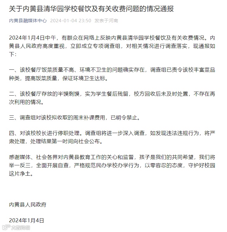 对此,关于家长反映的情况,内黄县人民政府高度重视,立即成立专项调查组,对相关情况进行调查落实,现通报如下: