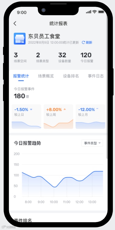 同时系统可汇聚所有门店的视频监控及告警信息,并进行统计分析。管理人员可在后台直接查看区域报警统计、事件报警统计、时段报警统计等内容,进行违规事件取证,提出针对性的修改建议,强化管理。