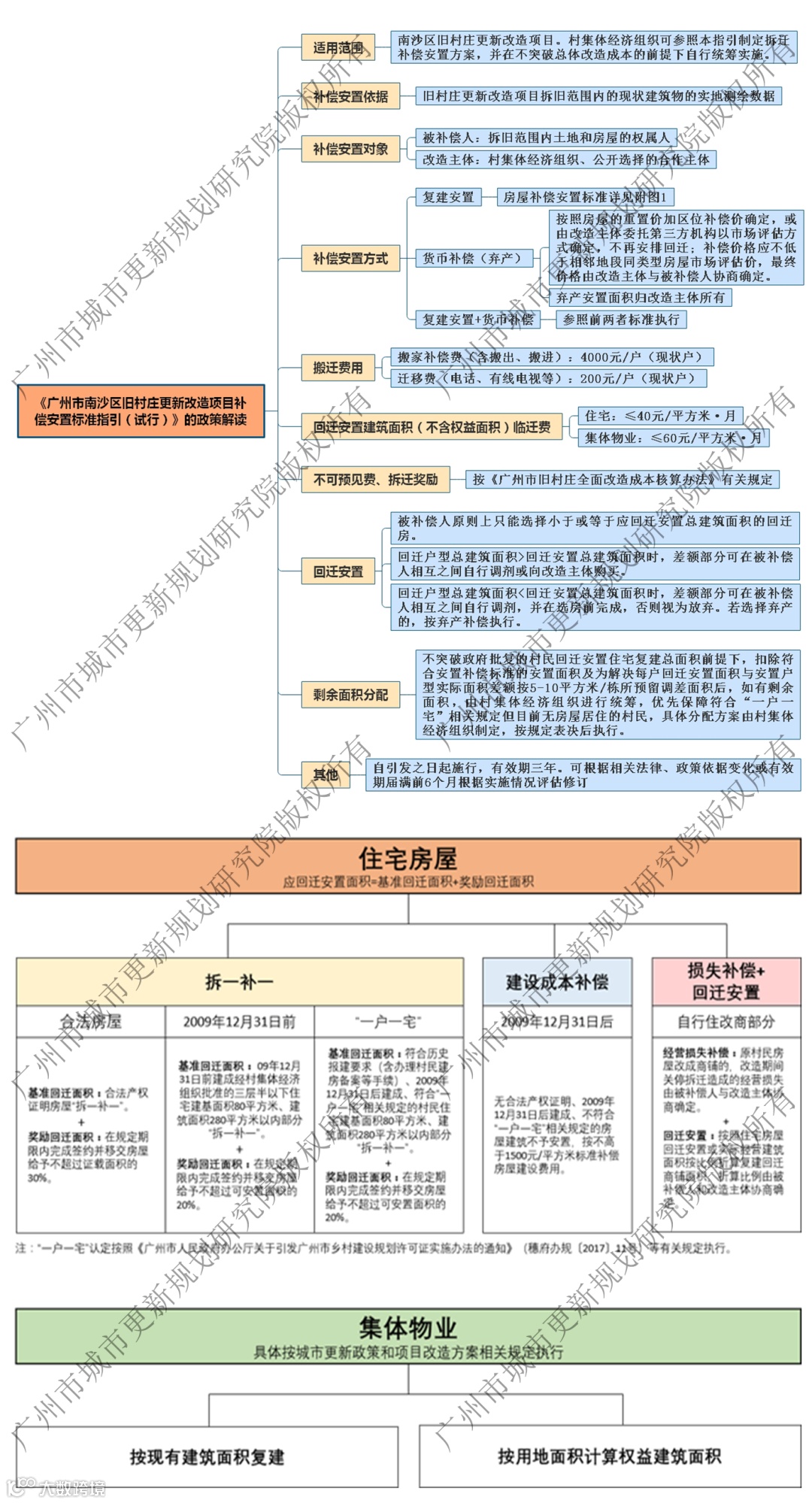 本《标准指引》共十一章二十条,相较于原《广州市规划和自然资源局南沙区分局关于印发〈南沙区旧村庄全面改造拆迁补偿标准工作指引(试行)〉的通知》(穗规划资源南〔2019〕370号,下称原《工作指引》),该新政内容更为详细规范,补偿安置方式更加灵活,补偿标准更加精细完善,主要体现在“回迁激励、弃产补偿、回迁安置”等方面。