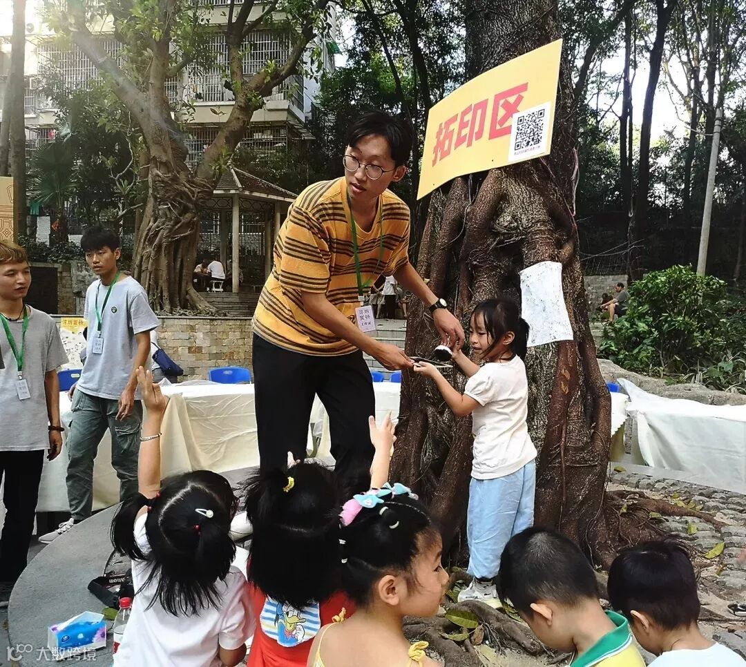 由广州美术学院美术教育学院师生团队负责策划的“黉桥印象”艺术教育活动沿小广场的树池展开,左右各分为拓印区与版画区。拓印活动以明信片、宣纸为载体,旨在引导居民驻足,细心观察社区的一草一木、一砖一瓦、一街一巷,拓印下自己喜爱的“原生肌理”,并以此为基础进行创作展示,希望将以往在社区生活中易被大家忽略的美通过艺术创作形式得以展现,再将美回归到生活中。