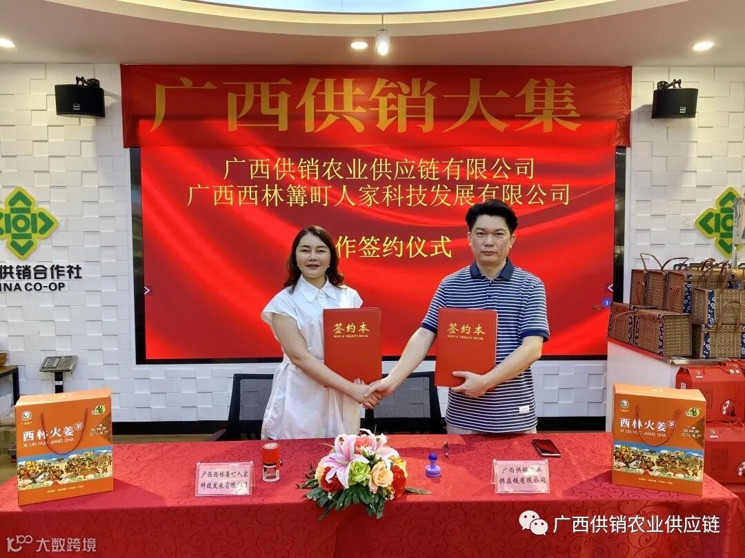 6月21日上午,广西供销农业供应链有限公司与广西西林篝町人家科技发展有限公司正式签订品牌联名合作协议。广西供销农业供应链有限公司运营部负责人曾志超与广西西林篝町人家科技发展有限公司法定代表人何星艳分别代表双方签约。