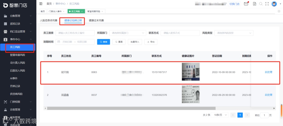 东贝食安采用智能晨检仪,对食堂员工进行每日自主例行晨检,系统统计员工晨检数据记录与员工健康证问题预警,同时支持定期对员工进行食品安全知识和技能的培训,提高其食品安全意识和操作水平。