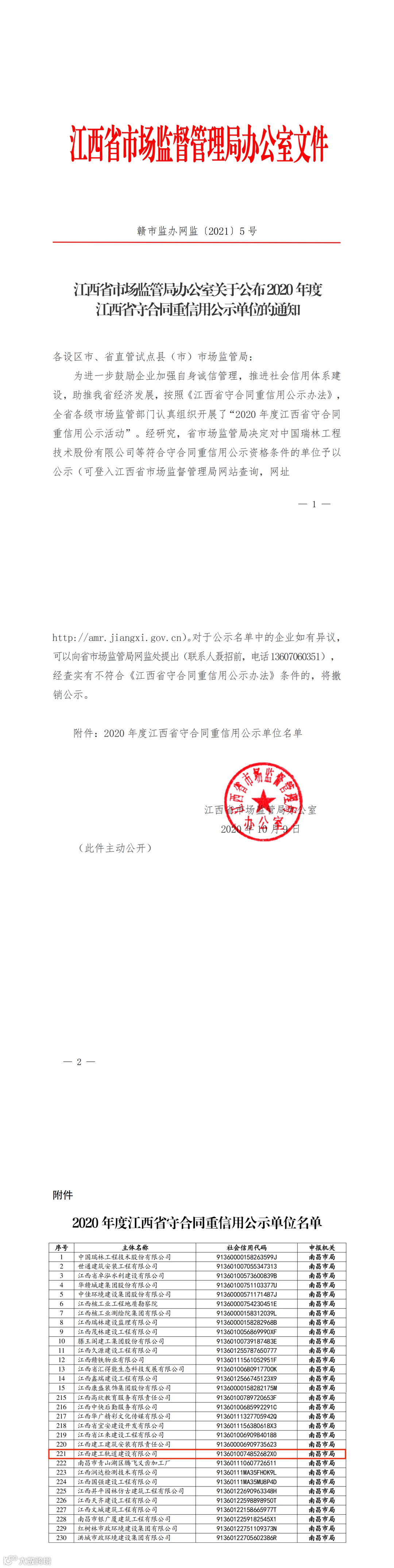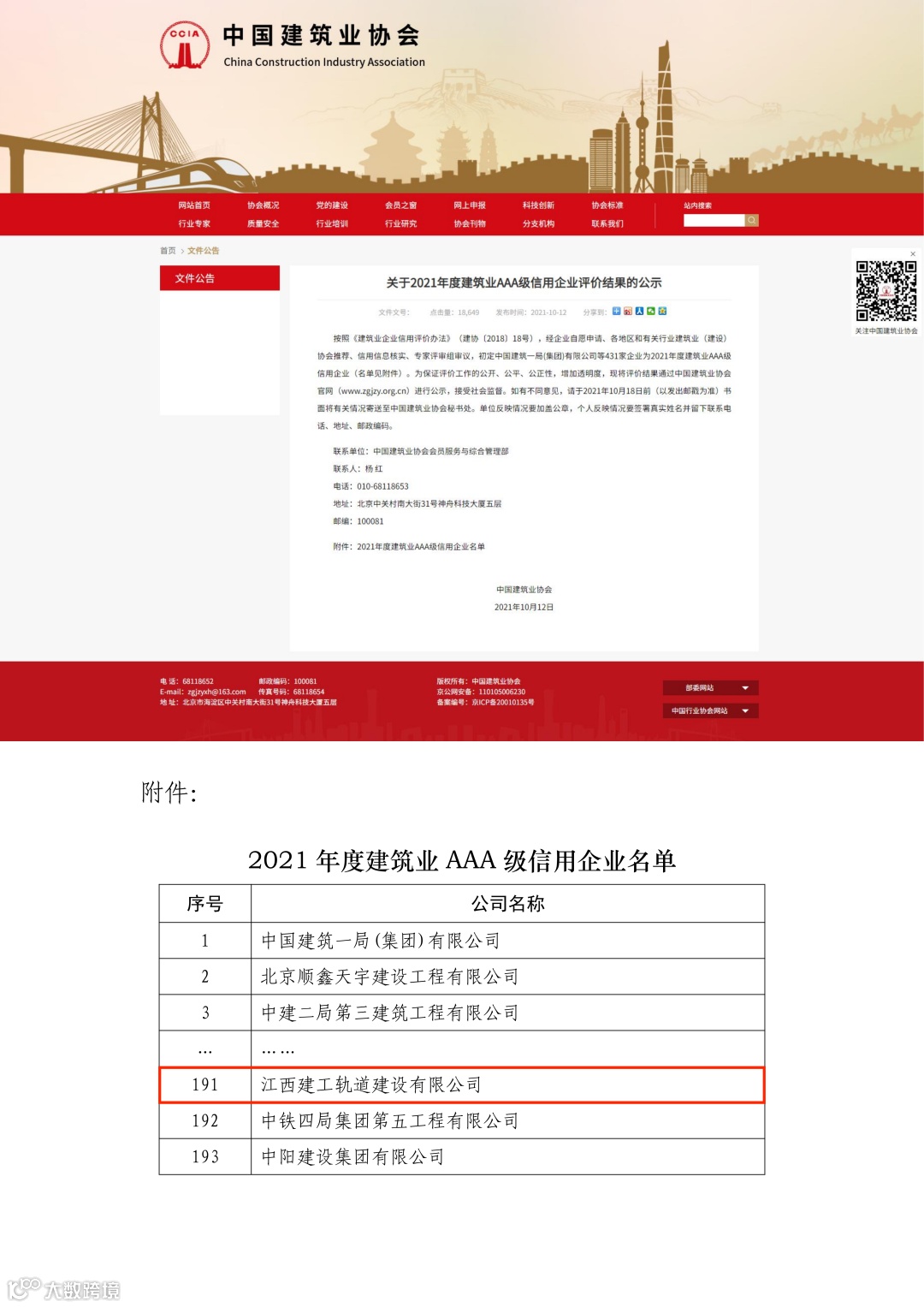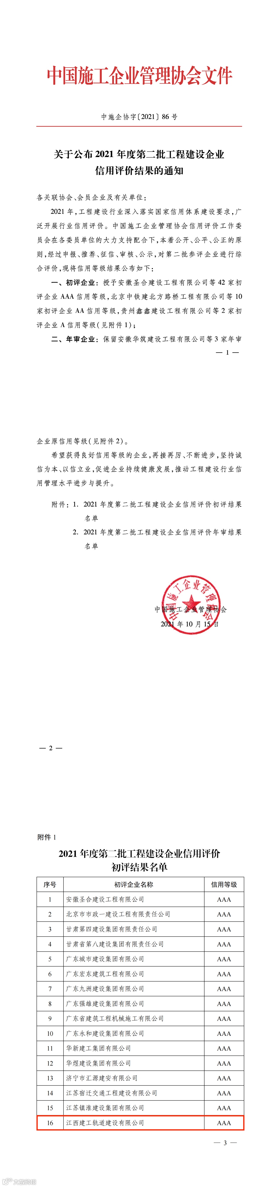 近日,公司喜讯频传,增添三项企业信用荣誉。我公司先后通过了中国施工企业管理协会、中国建筑业协会、江西省市场监管局对我公司相关的信用、资格的审查,荣获中国施工企业管理协会2021年度工程建设企业AAA信用等级、中国建筑业协会2021年度建筑业AAA级信用企业、2020年度江西省守合同重信用单位等荣誉。
