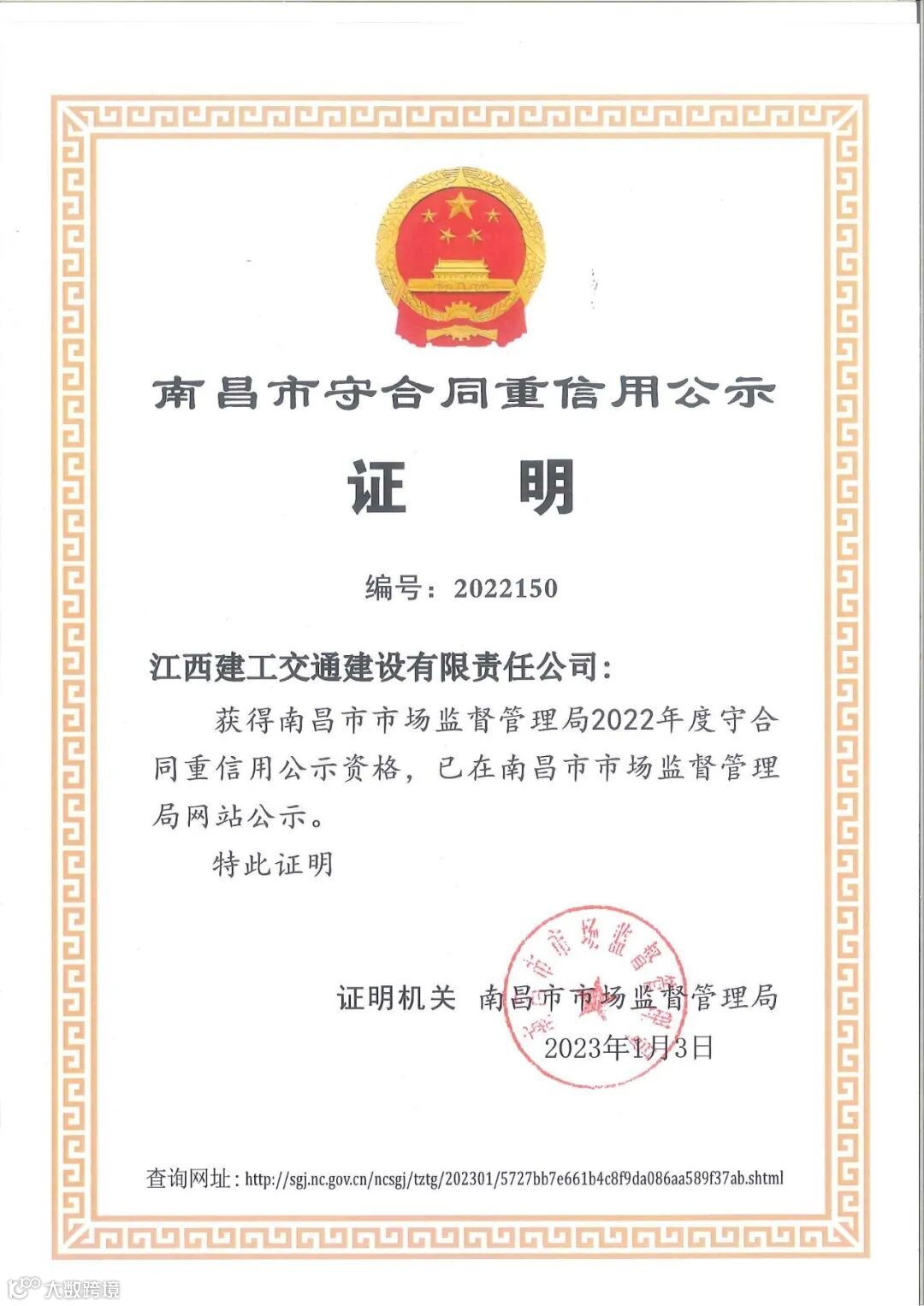 近日,南昌市市场监督管理局公布了2022年度南昌市守合同重信用公示单位名单,江西建工交通建设有限责任公司入选。
