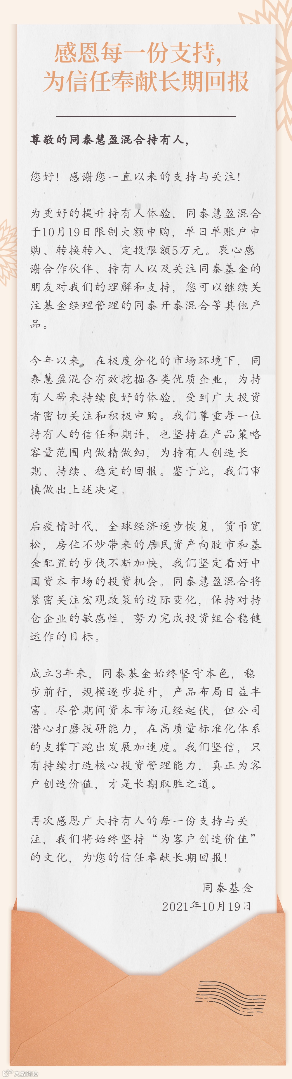 为更好的提升持有人体验,同泰慧盈混合于10月19日限制大额申购,单日单账户申购、转换转入、定投限额5万元。