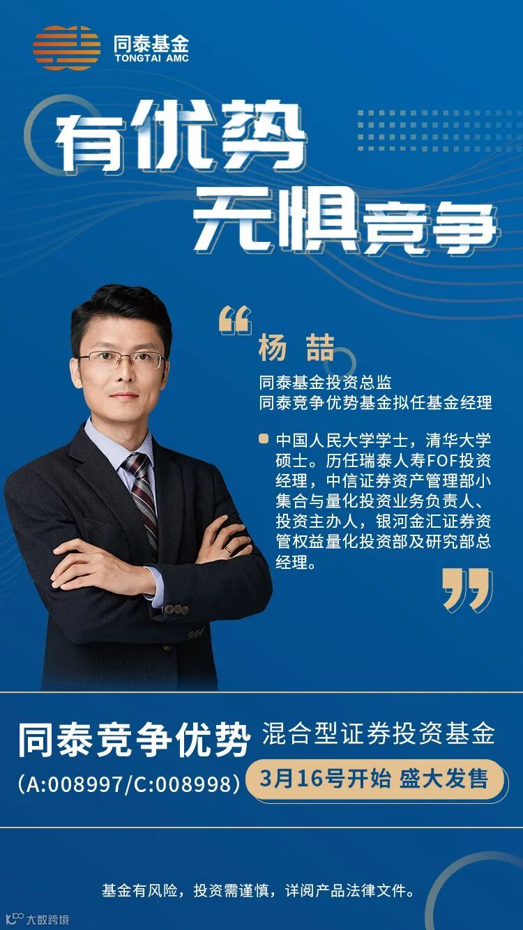 风险提示:同泰竞争优势混合型证券投资基金适当性风险等级为中高风险等级。基金管理人承诺以诚实信用、勤勉尽责的原则管理和运用基金资产,但不保证本基金一定盈利,也不保证最低收益。本基金的过往业绩及其净值高低并不预示其未来业绩表现,基金管理人管理的其他基金的业绩不构成对本基金业绩表现的保证。投资者在投资本基金前,请务必认真阅读《基金合同》及《招募说明书》等法律文件,关注投资者适当性管理规定,提前做好风险测评,根据自身风险承受能力选择与之相匹配的风险等级产品。