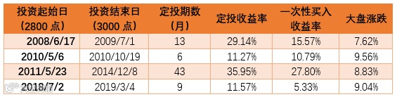 假如我们在上证综指2800点开始,通过按月定投或者一次性买入的方式投资于wind股票型基金指数,那么当上证综指再次回归到3000点时,我们可以得到以下4段时间的收益率效果: