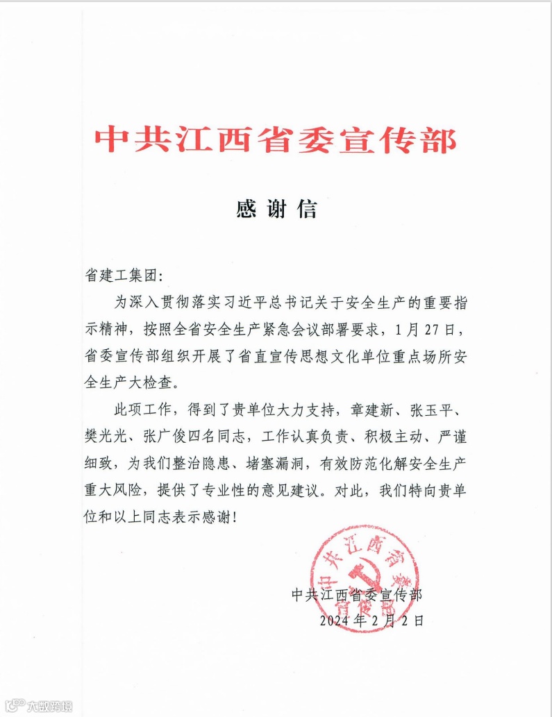 据悉,在1月27日省委宣传部组织开展的省直宣传思想文化单位重点场所安全生产大检查中,江西建工国内工程公司第四分公司章建新、张玉平、樊光光、张广俊四名同志工作认真负责、积极主动、严谨细致,为省委宣传部整治隐患、堵塞漏洞,有效防范化解安全生产重大风险提供了专业化的意见建议。对此,省委宣传部在信中对公司和上述4名同志表示感谢。