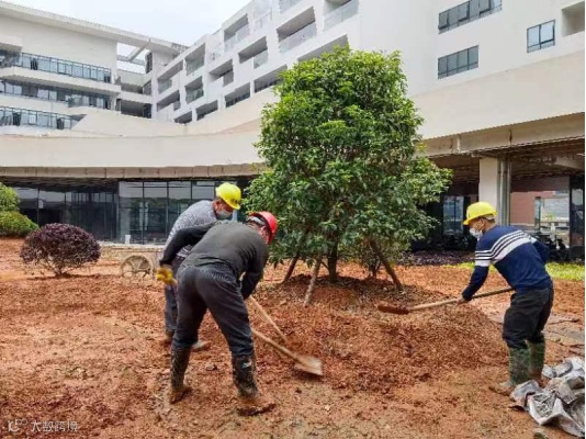 南昌象湖老年养护中心项目,绿化班组万福平、卢高红、卢华金正在种植灌木