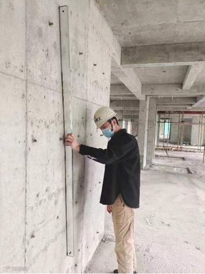 莆田市城厢区洋西片区安置地块A项目,技术负责人代秀峰,正在进行墙面平整度检查,墙体强度检查