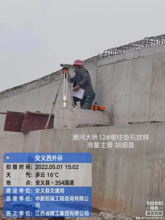 安义西外环路工程项目,测量主管胡细昌,正在进行潦河大桥12#墩柱垫石放样