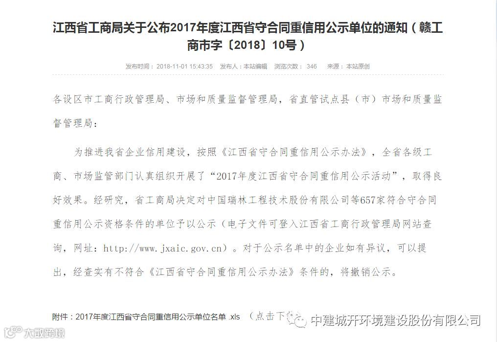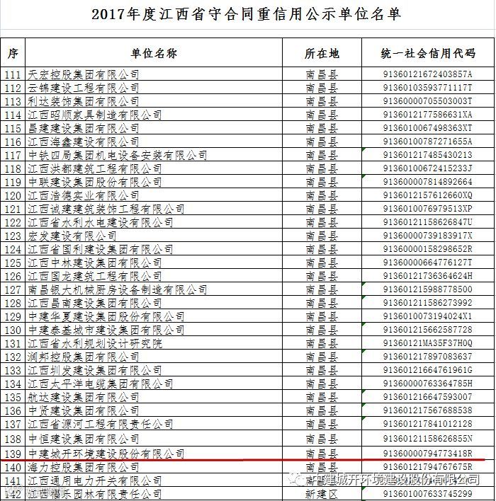 近日,“2017年度江西省守合同重信用公示活动”结束,中建城开环境建设股份有限公司顺利通过评审,连续三年获评“江西省守合同重信用”公示单位。
