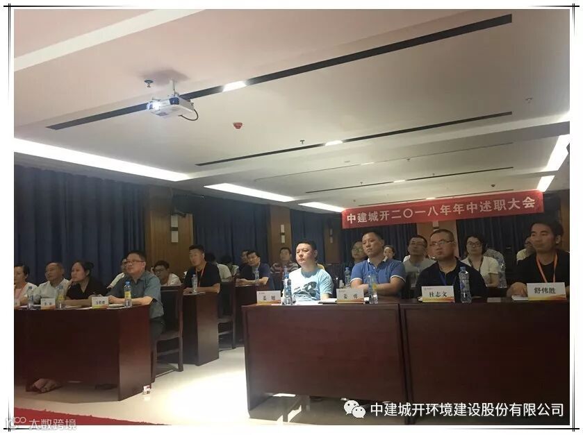 7月21日晚,中建城开在11楼多媒体培训室组织召开了2018年年中述职大会。董事长姜旭、执行总裁万程骋、各分管副总裁、各项目负责人、各职能部门主管及以上人员约40人参加了本次会议。