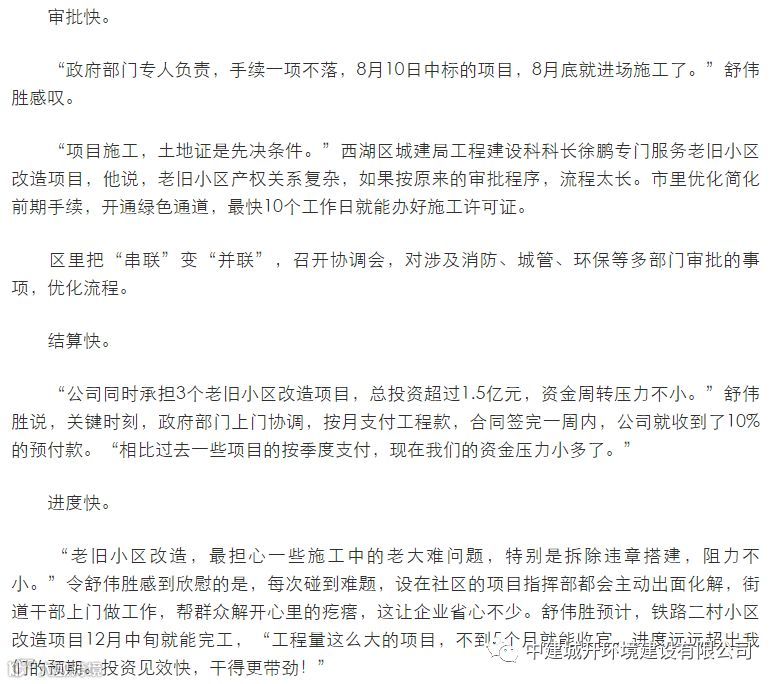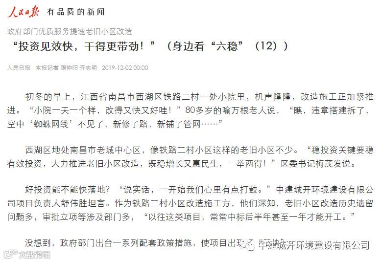 12月2日,由中建城开环境建设有限公司 承建的2019年西湖区铁路社区、东书院社区、广厦社区及桃花镇一村(城中村)综合改造工程EPC总承包项目荣登当日人民日报、中国日报网等多个新闻媒体头版头条,该项目总投资超1.5亿元,改造总面积约66.8万平方米。