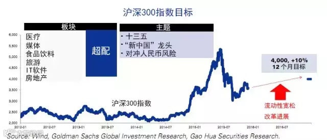 高盛在最新发布的2016年A股策略报告中预计,到2016年底,沪深300指数将上涨10%,站上4000点。疲弱的经济基本面和充分的流动性将使得2016年“新中国”的表现好于“旧中国”。