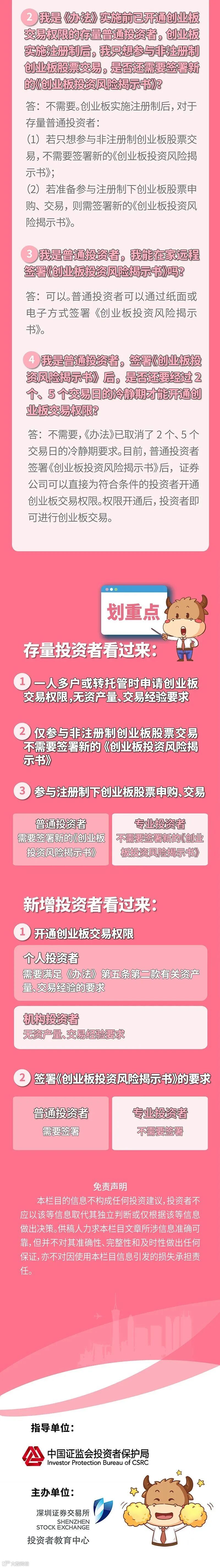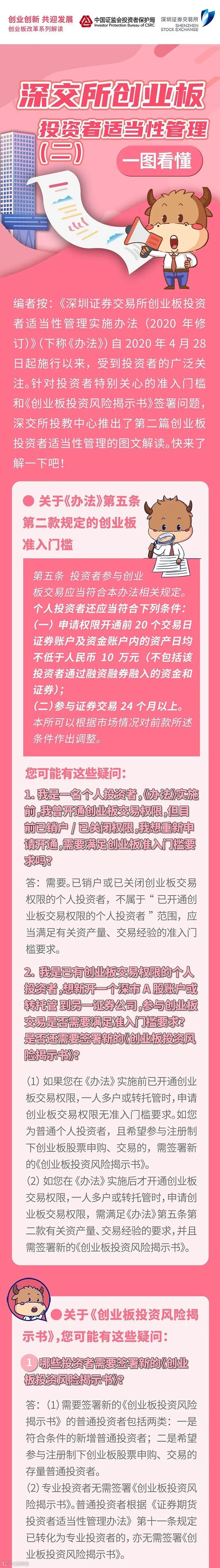 《深圳证券交易所创业板投资者适当性管理实施办法(2020年修订)》(下称《办法》)自2020年4月28日起施行以来,受到投资者的广泛关注。针对投资者特别关心的准入门槛和《创业板投资风险揭示书》签署问题,深交所投教中心推出了第二篇创业板投资者适当性管理的图文解读。快来了解一下吧!