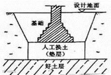 垫层法是指把基础下一定深度的湿陷性黄土换填成好的土层,以减小建筑物的沉降,提高地基承载能力。此方法施工方便且地基在施工后得到明显改善,故在我国得到广泛应用。