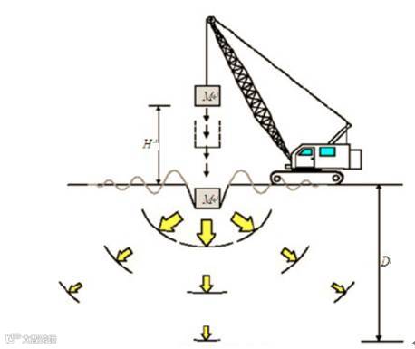 强夯法也称动力固结法,是指通过重锤自一定高度下落夯击土层使地基迅速固结的方法,从而增大压实度,提高软弱地基的承载力。该方法具有操作简单、加固效果显著、变形沉降量小、施工速度快、经济成本低等特点。
