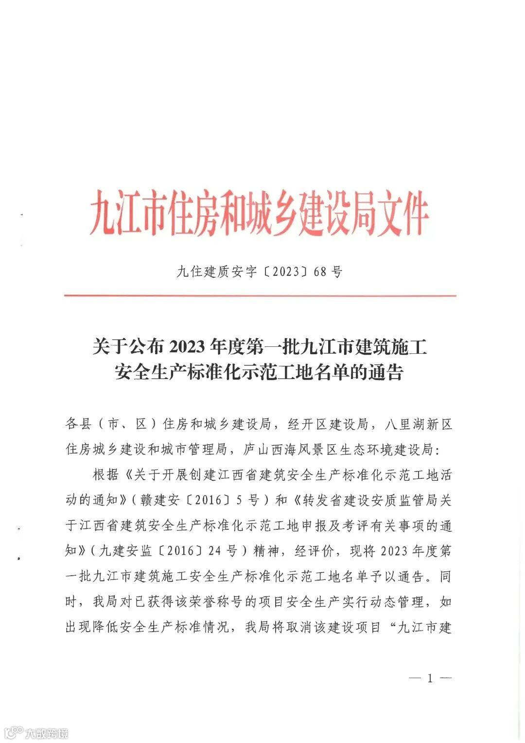 暑去凉秋至,收获正当时。近日,九江市住房和城乡建设局发文《关于公布2023年度第一批九江市建筑施工安全生产标准化示范工地名单的通告》,由我司承建的《德安县第三中学学生宿舍楼》项目和《浔阳区游岭骨灰堂建设项目》双双获评2023年度“九江市建筑施工安全生产标准化示范工地”荣誉称号。