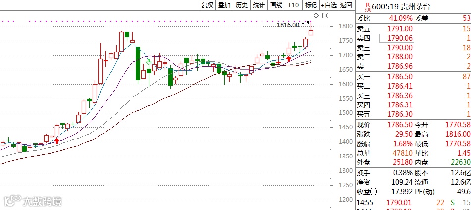 盘面上,A股“股王”贵州茅台再一次上演了气势磅礴的大涨行情。在早盘的时候贵州茅台的股价顺利突破1800元重要关口,总市值突破2.27万亿。