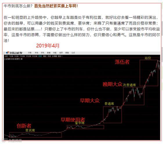 创新扩散理论是大众传播效果研究的重要成果,对我们的意义在于:它可以完美的适配大众群体对于一个“理念”的接受过程,这里的“理念”,用A股通俗的话来讲,就是所谓的“主题”。有意思的是创新扩散理论和我在2019年4月所做的研究,关于牛市周期中投资者入场现象是完全一样的。