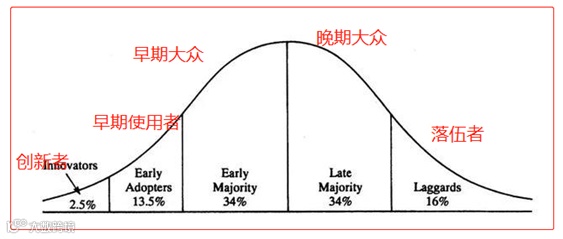 1962年,这两名科研人员根据试验的结果,提出了著名的创新扩散理论,并出版了《Diffusion of Innovations》一书,书中其提出了著名的S-曲线,该曲线本质上就是农民采纳种子人数曲线的变种。该曲线分成:2.5%的创新者、13.5%的早期使用者、34%的早期大众、34%的晚期大众、以及16%的落伍者。