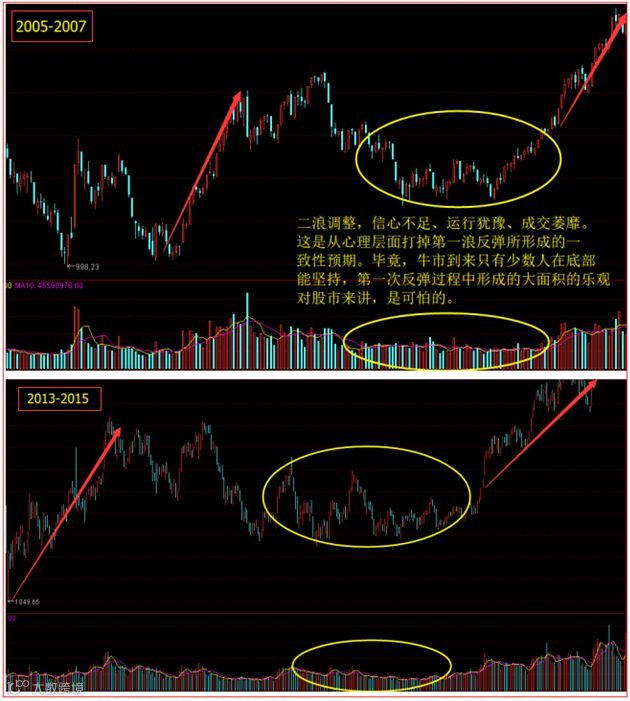 技术上看,几乎每一次牛市二浪调整过程都比较长,目的是打破在一浪反弹过程中形成的一致性乐观,毕竟牛市的底部属于少数人,让多数人在犹豫与悲观中失去低位持股的机会,然后才会在追涨中抬高成本,这样才能将牛市延长并进行下去。