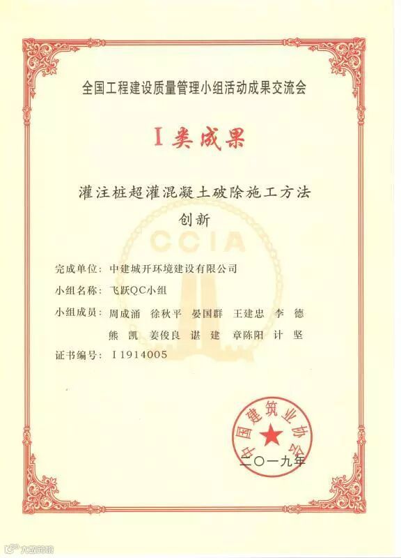 日前,从2019年度全国工程建设质量管理成果交流会上传来捷报,中建城开的飞跃QC小组的成果《灌注桩超灌混凝土破除施工方法创新》为公司夺得全国工程建设QC成果一等奖,并作为具有推广应用价值的发布成果全国公开出版2019年《全国工程建设质量管理小组活动成果选编》。