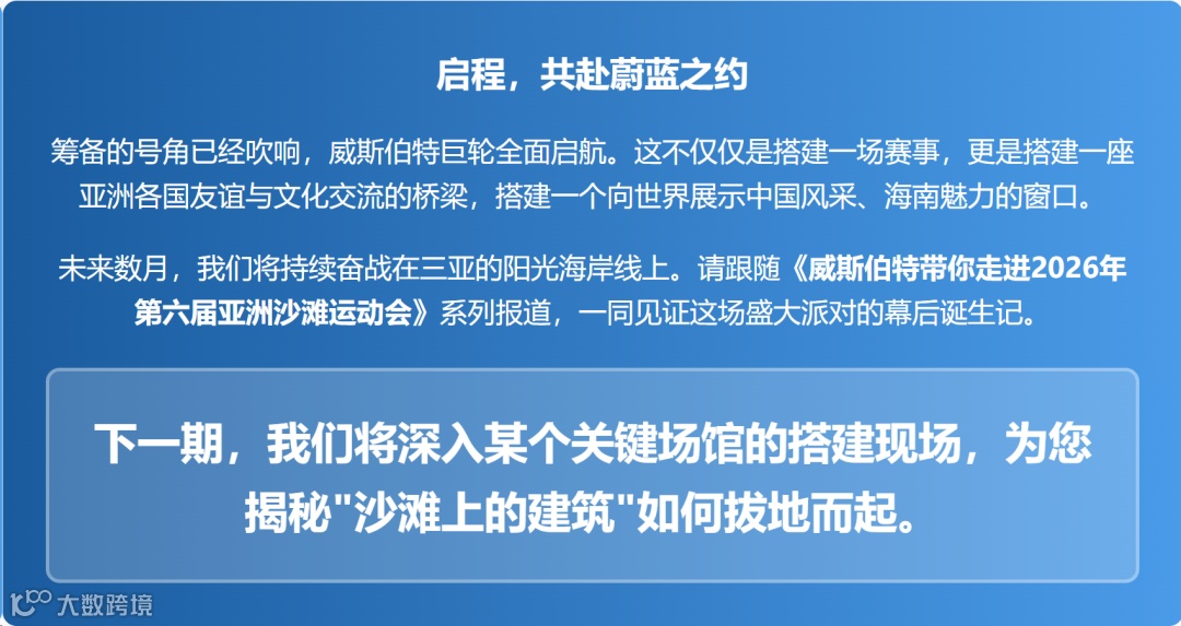 清晨的海风拂过三亚亚龙湾,碧海金沙依旧宁静,但一场跨越国界的体育盛宴已悄然按下启动键。2026年第六届亚洲沙滩运动会进入倒计时,而我们——威斯伯特,已率先抵达这场盛会的核心地带。