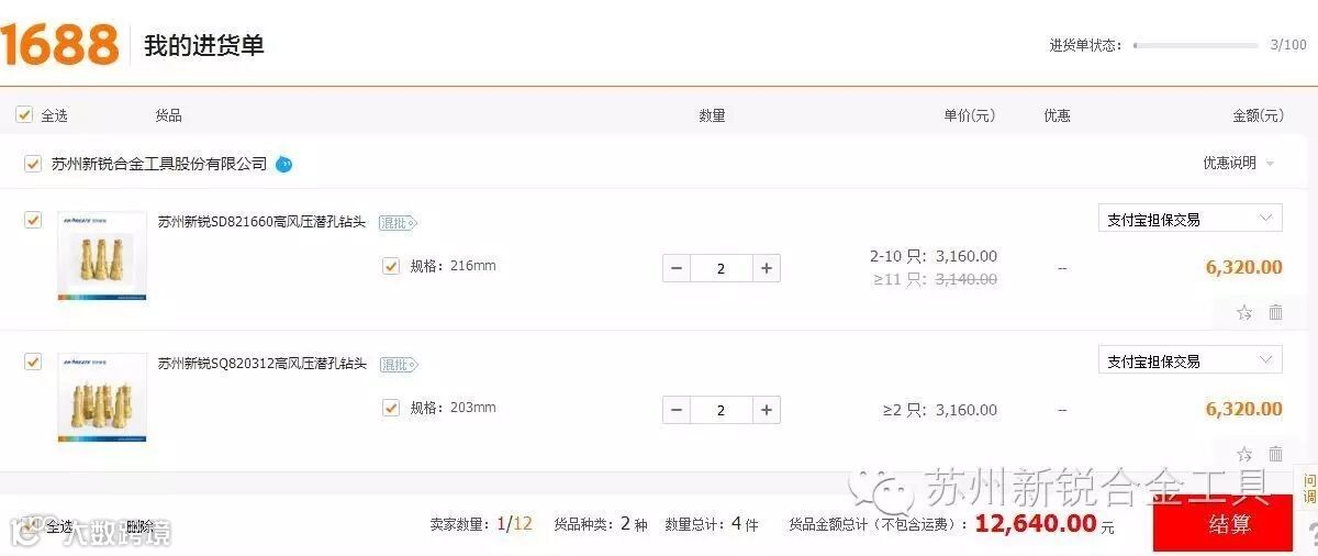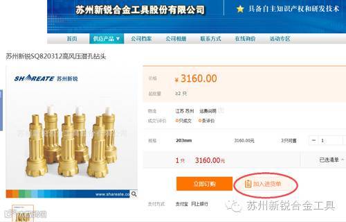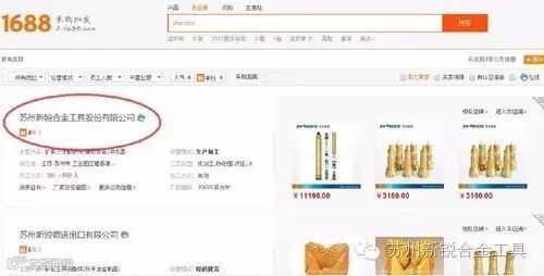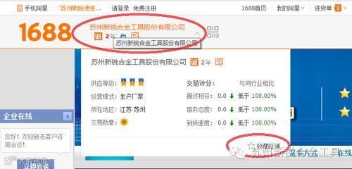2)或打开阿里首页(https://www.1688.com),在搜索栏“供应商”中输入“shareate”。点击“苏州新锐合金*****”进入公司阿里店铺,如图所示;