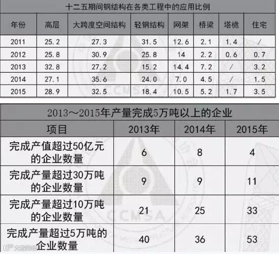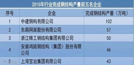 钢结构完成产能5万吨上骨干企业数量总数2015年超过50家。2015年,前5家企业完成产能298万吨,占全年建筑钢结构用钢量的5.9%左右,整个行业的集中度仍然不高。