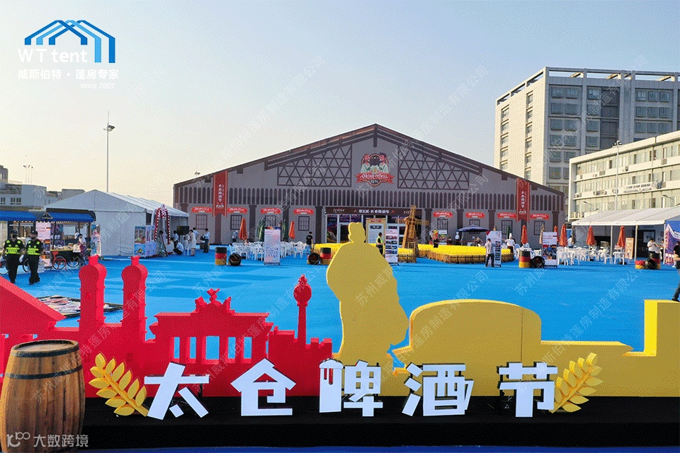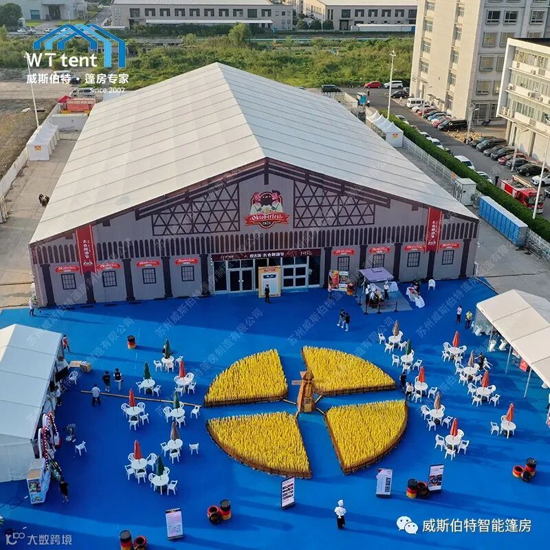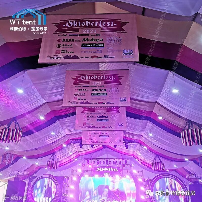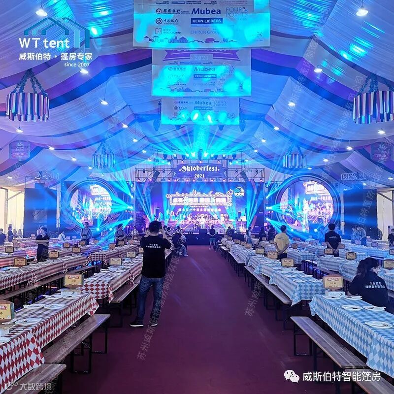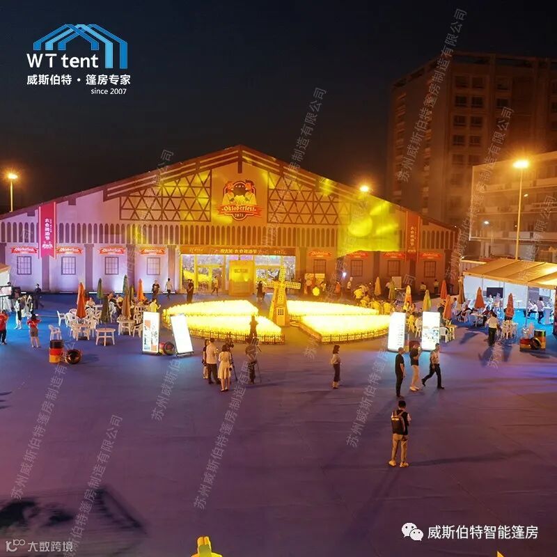 美观大气的装配式篷房、洁净飘逸的德国风情装饰幔、本色本香的德式啤酒桌,柔软平整的纯色地毯,在音乐和美食的融合下,汇成一场激昂热情的啤酒节狂欢盛宴。