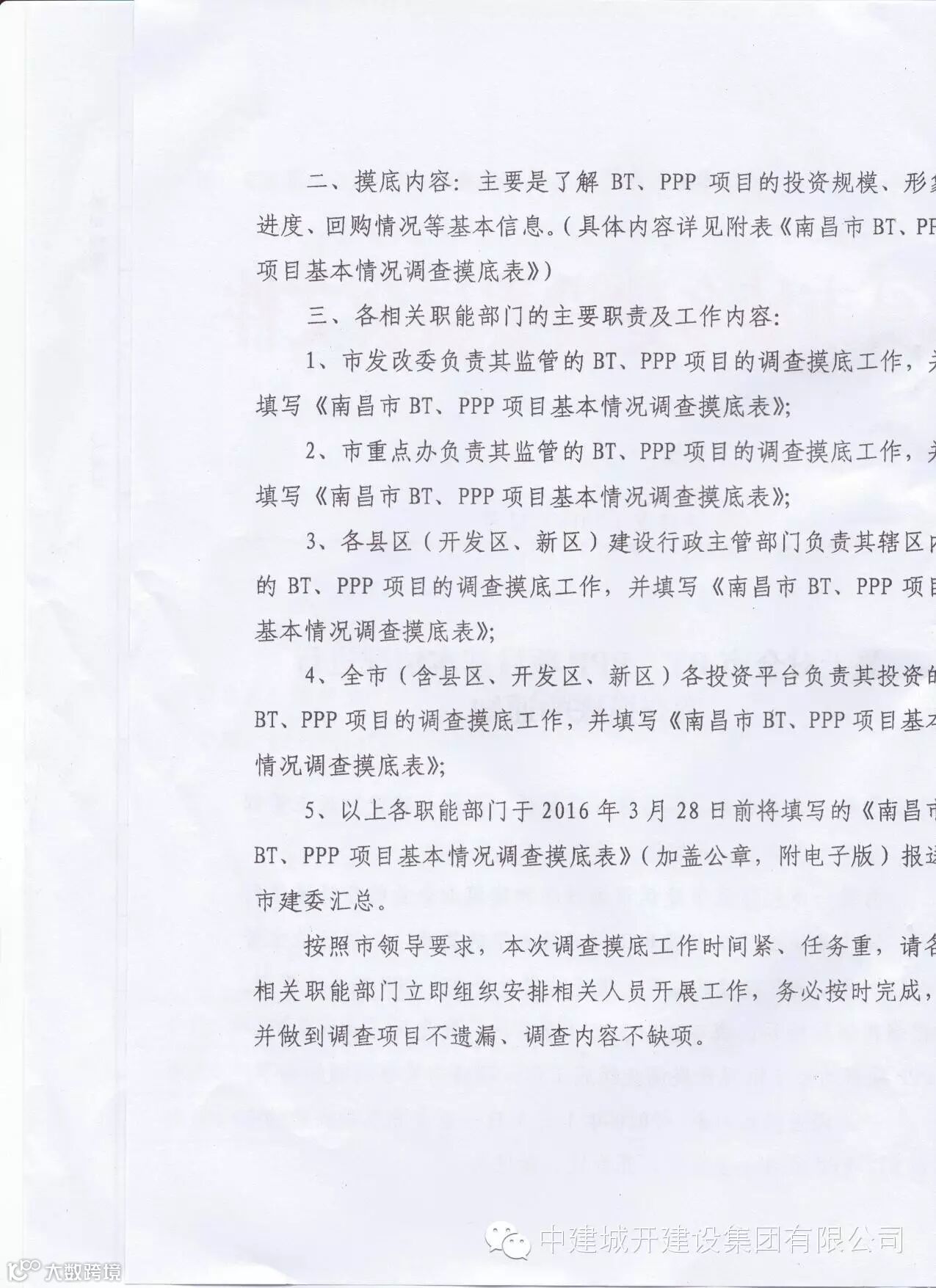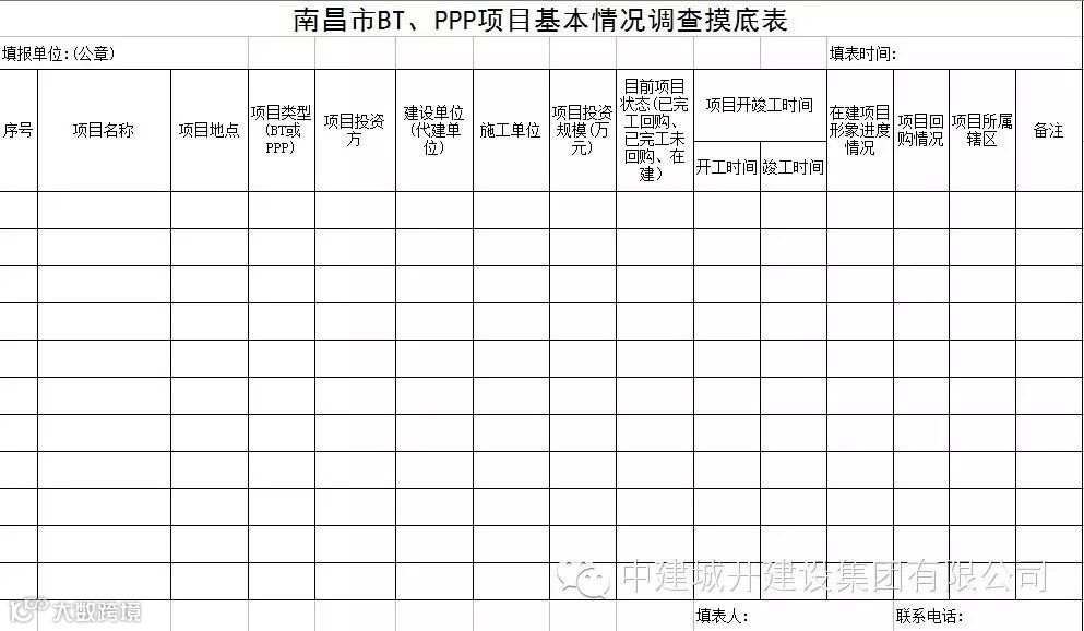 4、全市(含县区、开发区、新区)各投资平台负责其投资的BT、PPP项目的调查摸底工作,并填写《南昌市BT、PPP项目基本情况调查摸底表》;