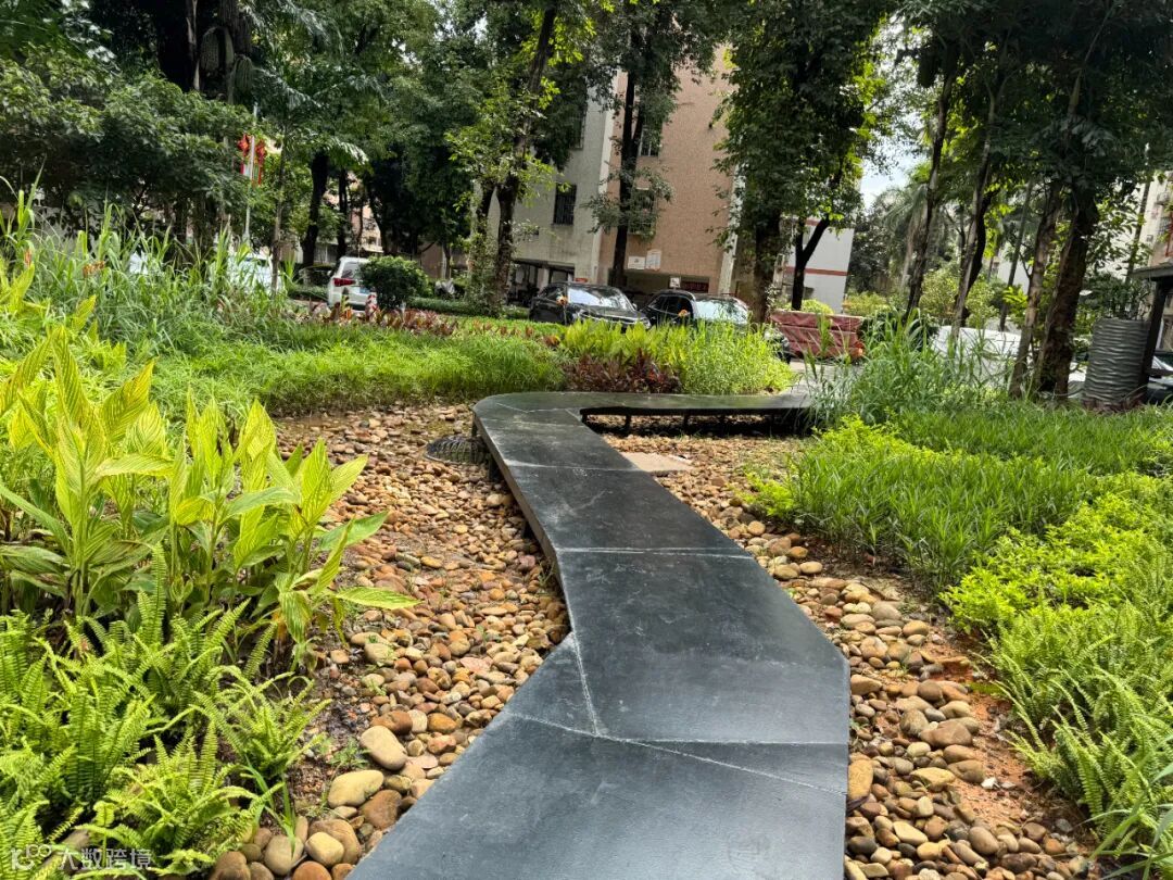 遵从生态优先原则,引入“海绵城市”理念,设计雨水花园、透水铺装、下沉式绿地等,并增加自然科普功能,为附近学校师生提供可开展自然科学的户外课堂,同时为社区提供静谧的休闲小花园,让社区充满生机活力。