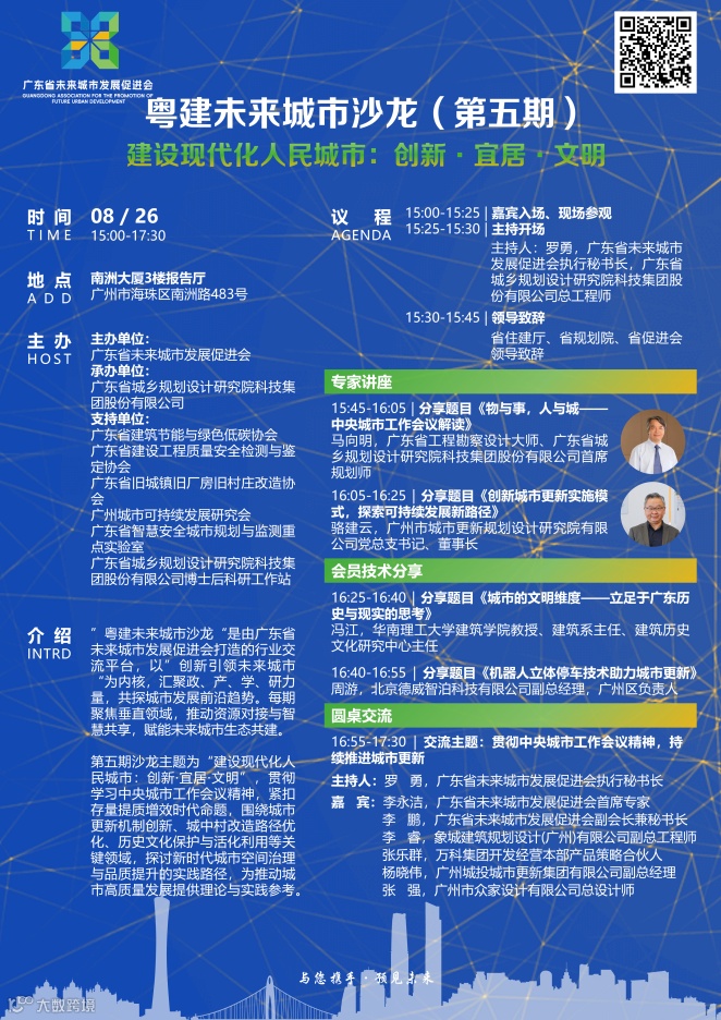 8月26日,广东省未来城市发展促进会(以下简称“省促进会”)组织举办“粤建未来城市沙龙(第五期)”。活动紧扣2025年中央城市工作会议核心部署,以“建设现代化人民城市:创新・宜居・文明”为主题,旨在聚焦城市更新、城市内涵式发展、历史文化保护等关键领域,通过行业深度对话和实践经验分享,对中央城市工作会议精神进行深入解读,为推动构建现代化人民城市可持续发展提供思考。