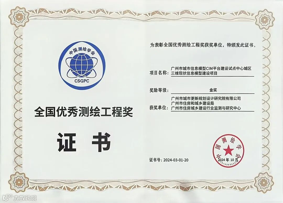 10月16日-17日,2024中国测绘地理信息科学技术年会在郑州举行。大会举行了2024年度中国测绘学会相关奖项颁奖仪式,我院技术成果《广州市城市信息模型CIM平台建设试点中心城区三维现状信息模型建设项目》荣获2024年全国优秀测绘工程奖金奖并获颁证书。