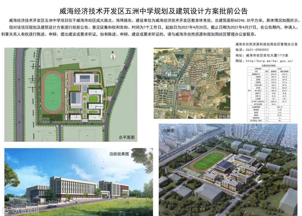 2021年4月20日,威海威海市自然资源和规划局经区管理办公室发布五洲中学规划及建筑设计方案批前公告:威海经济技术开发区五洲中学项目位于威海市经区成大路北、海埠路东。建设单位为威海经济技术开发区教育体育处,总建筑面积65246.35平方米,具体情况如图所示。