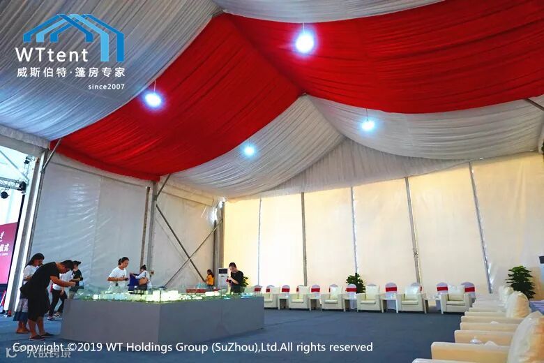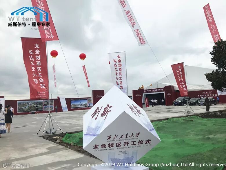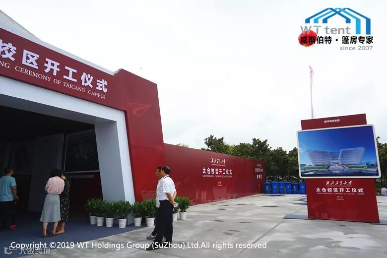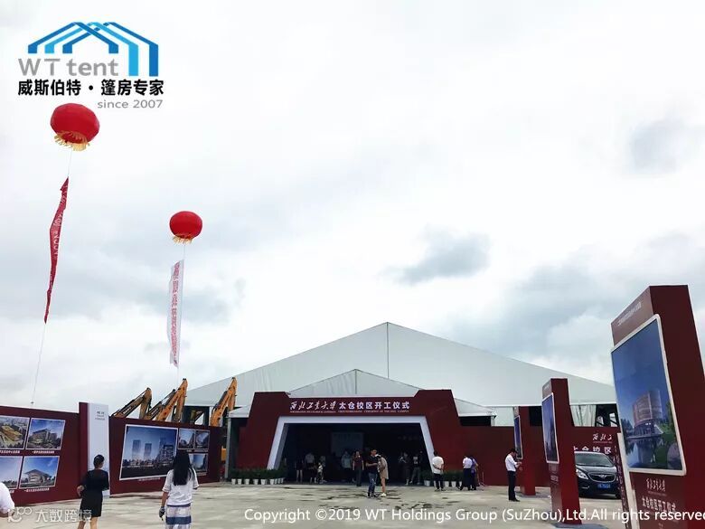 西北工业大学太仓校区奠基仪式就在校区选址地举办,还有一所中西结合的世界名校——西交利物浦大学也规划在其中,由于目前这里还是一片荒芜的空地,威斯伯特智能篷房为本次奠基仪式设计了三个区域,分别为:40*40米的主会场、15*15米的指引通道、15*20米的贵宾室,总占地面积达2000多平方米。