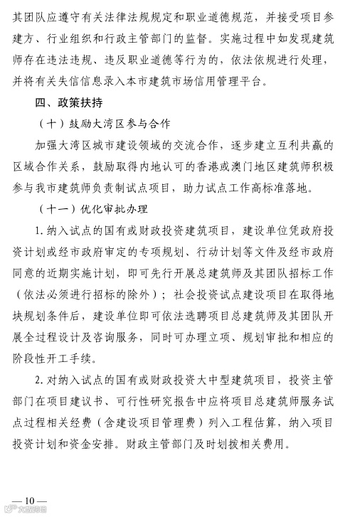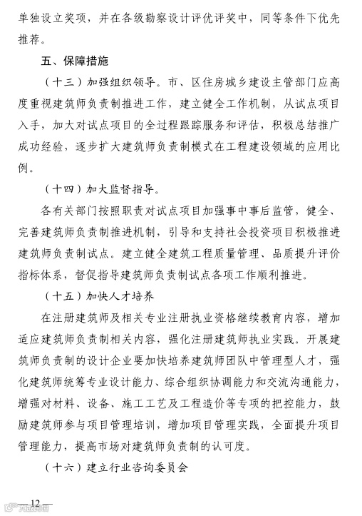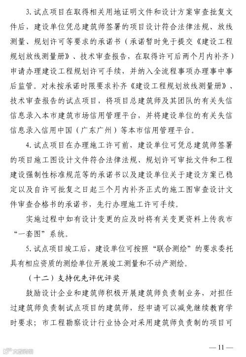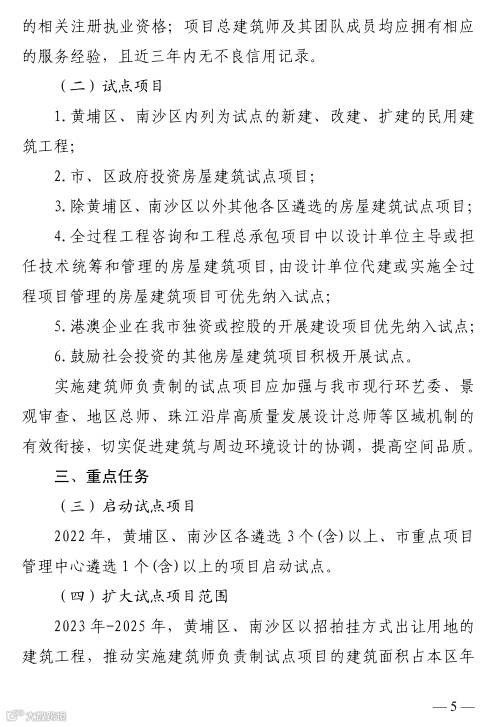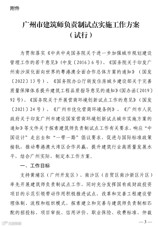 为贯彻落实《中共中央国务院关于进一步加强城市规划建设管理工作的若干意见》(中发〔2016〕6号)、《国务院关于印发广州南沙深化面向世界的粤港澳全面合作总体方案的通知》(国发〔2022〕13号)、《国务院办公厅转发住房城乡建设部关于完善质量保障体系提升建筑工程品质指导意见的通知》(国办函〔2019〕92号)、《国务院关于开展营商环境创新试点工作的意见》(国发〔2021〕24号)、《广州市优化营商环境条例》《广州市人民政府关于印发广州市建设国家营商环境创新试点城市实施方案的通知》关于探索建筑师负责制试点工作有关要求,响应“中国设计”走出去和“一带一路”倡议要求,促进与国际标准政策接轨,推动粤港澳大湾区合作共赢,提升建筑行业高质量发展水平,我局结合广州实际,组织制定了《广州市建筑师负责制试点实施工作方案(试行)》,现予印发,请遵照执行。实施过程中遇到的问题,请径向市住房和城乡建设局反映。